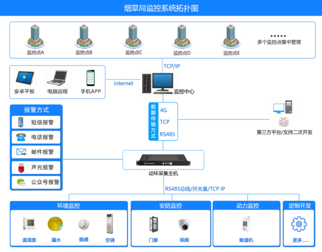 數據采集層:針對倉庫動力監控、環境監控、安全監控、微環境監控等數據采集模塊采集數據,通過各種總線傳送到監控主機;