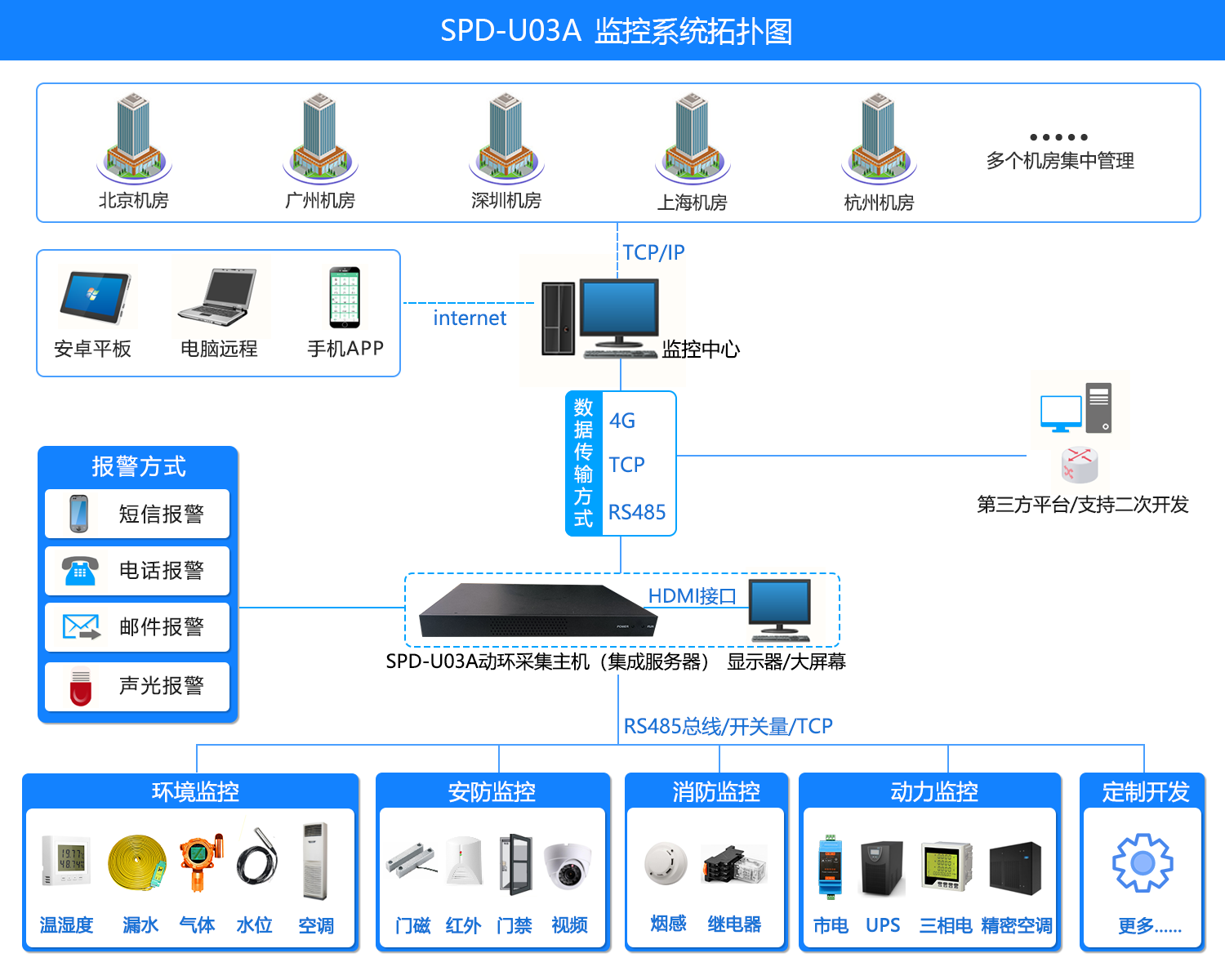 (5)接口豐富:係統提供基於RS485的MODBUS協議、SNMP協議、RS232串口等智能設備監控開發接口;同時係統還提供第三方接口,便於第三方軟件兼容;