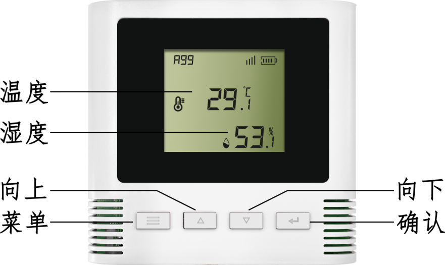 1. 主顯示界麵為:溫度及濕度當前值、SIM信號強度、電池電量信息。