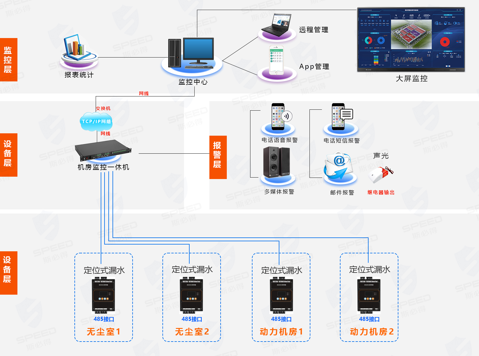 由於南方天氣雨水較多,導致部分機房及重點區域出現水浸現象,導致部分設備損壞,影響公司的正常運營,因此要求對於現有的東莞分公司所涉及的動力機房以及無塵室要求增加漏水監控管理功能,且必須要能定位到區域,可遠程實時監控情況,漏水報警功能要求有電話、短信、APP等。